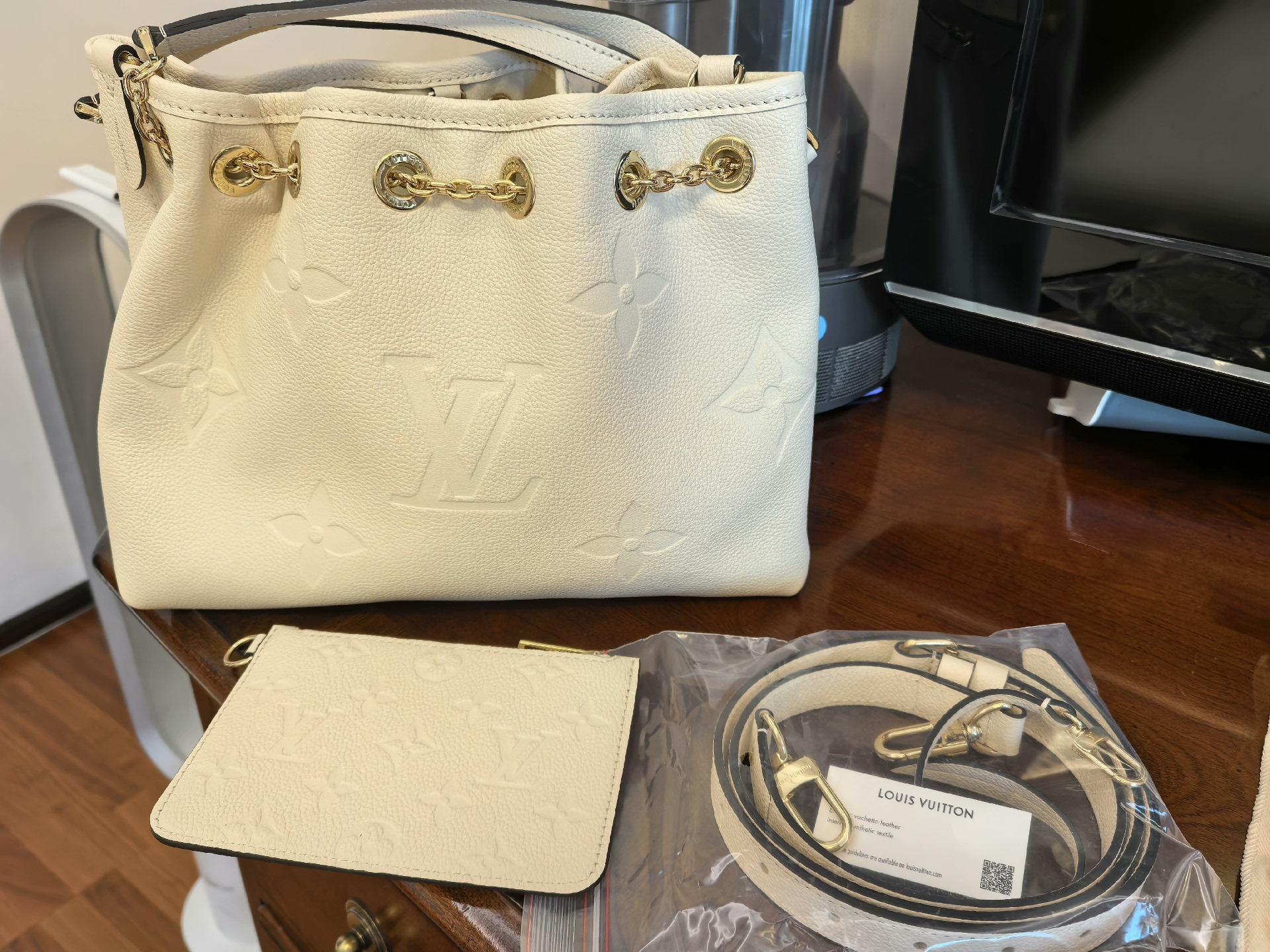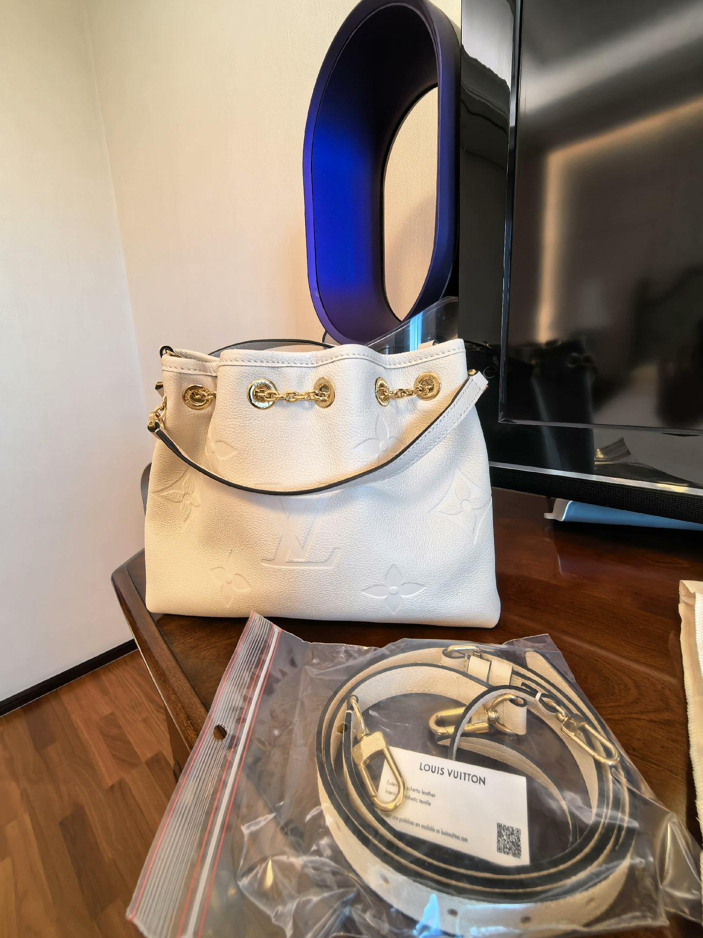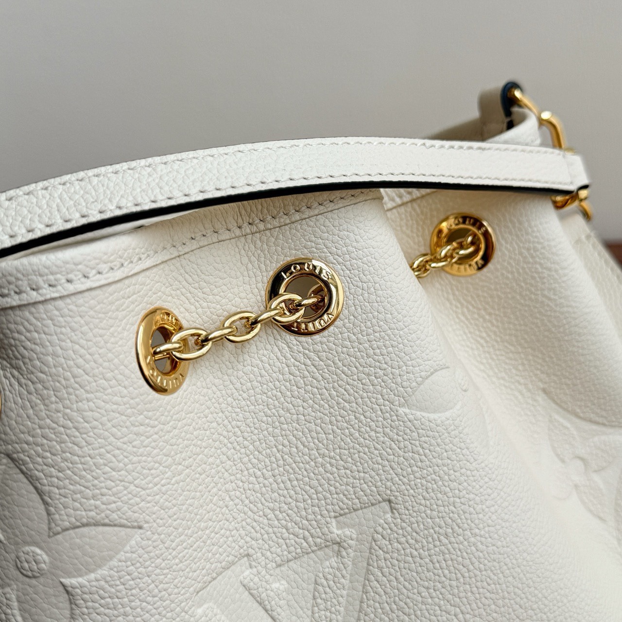 양각 처리한 모노그램 앙프렝뜨 카우하이드 가죽 소재로 선보이는 LV 번들(LV Bundle). 시선을 사로잡는 체인 드로스트링이 특징. 두 개의 핸들을 손으로 또는 팔에 걸쳐 들거나 탈착 가능한 스트랩을 조절하여 편안한 크로스 바디 백과 숄더 백으로 연출할 수 있는 아이템. 동일한 가죽 소재의 탈착형 내부 지퍼 파우치.