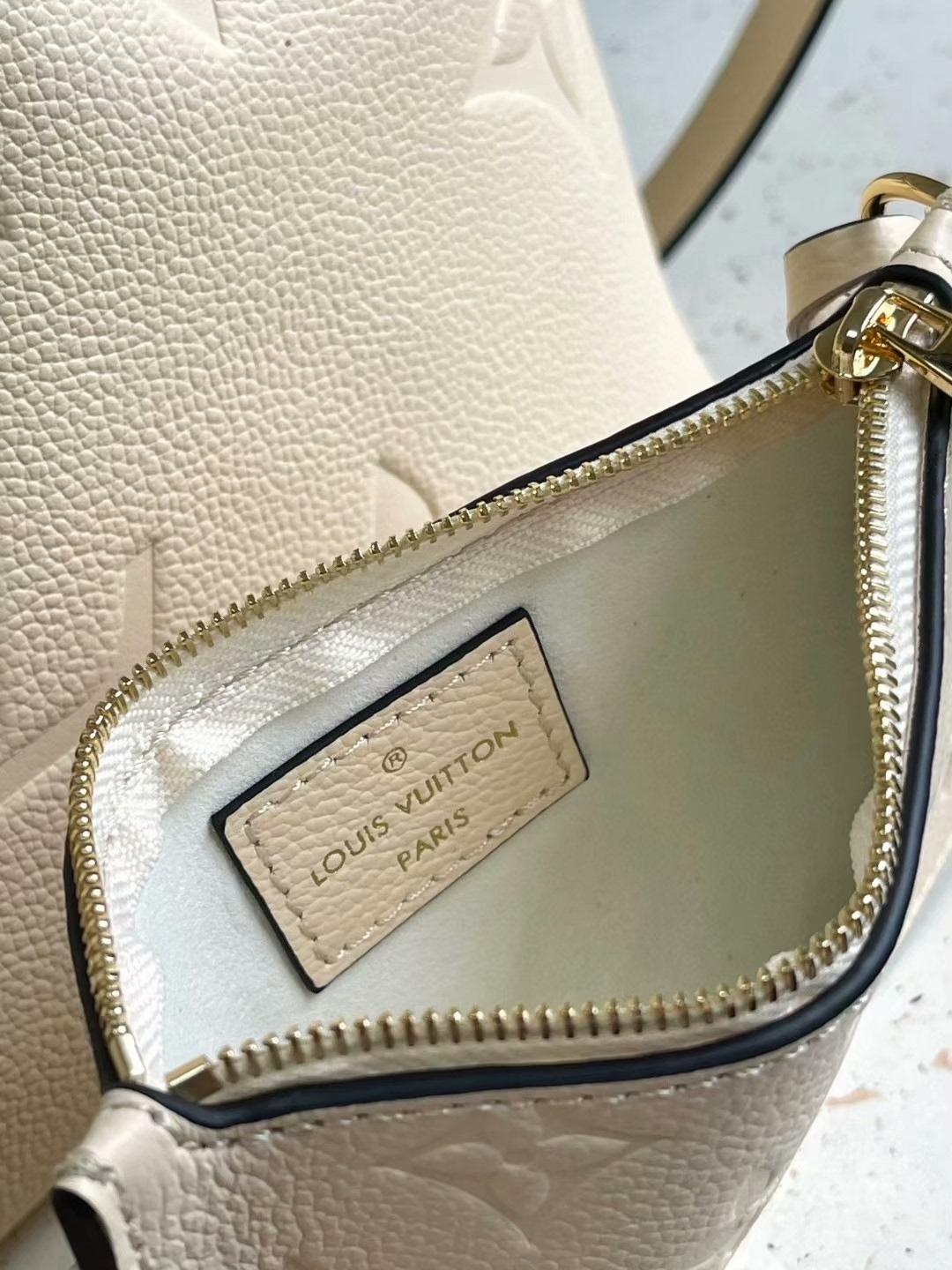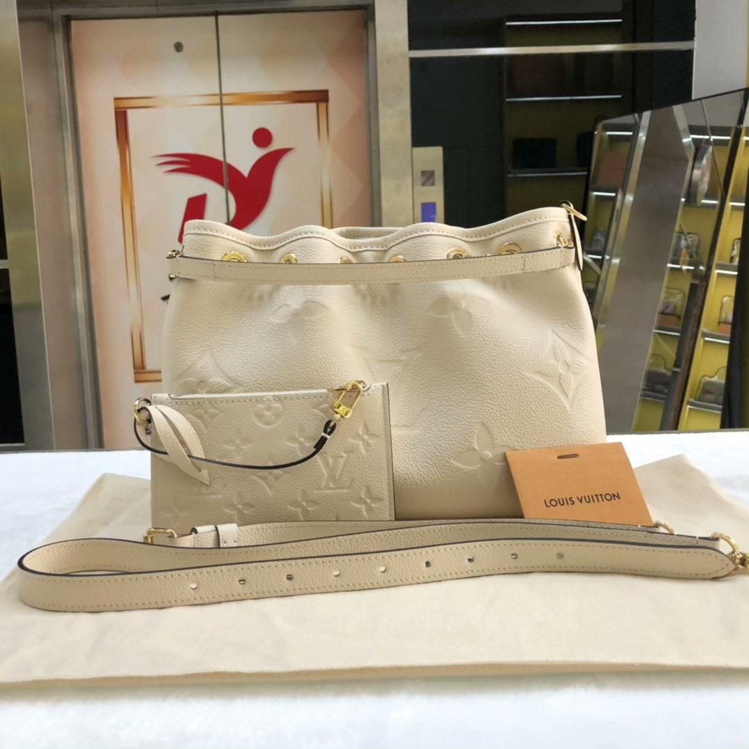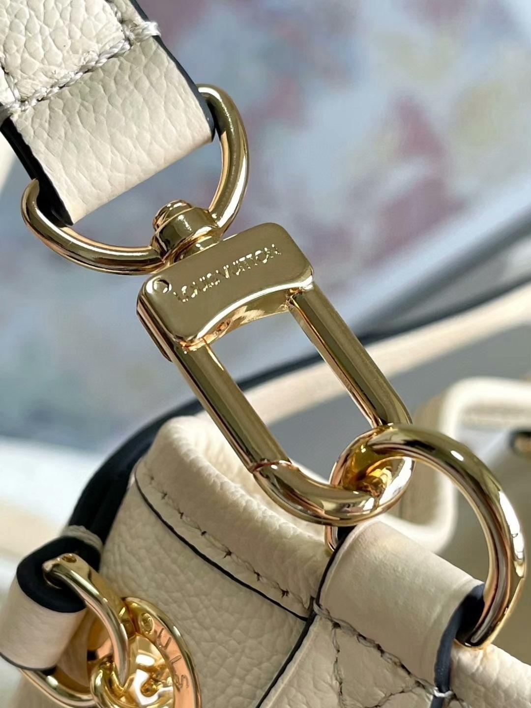 양각 처리한 모노그램 앙프렝뜨 카우하이드 가죽 소재로 선보이는 LV 번들(LV Bundle). 시선을 사로잡는 체인 드로스트링이 특징. 두 개의 핸들을 손으로 또는 팔에 걸쳐 들거나 탈착 가능한 스트랩을 조절하여 편안한 크로스 바디 백과 숄더 백으로 연출할 수 있는 아이템. 동일한 가죽 소재의 탈착형 내부 지퍼 파우치.