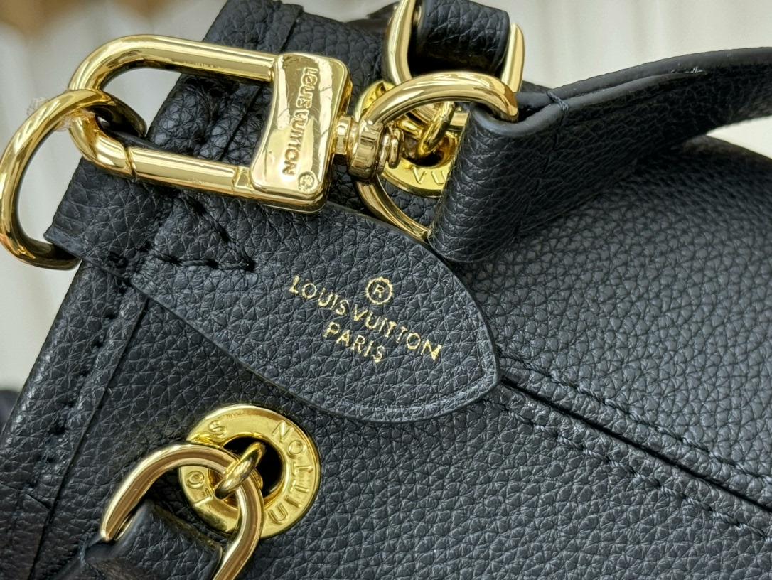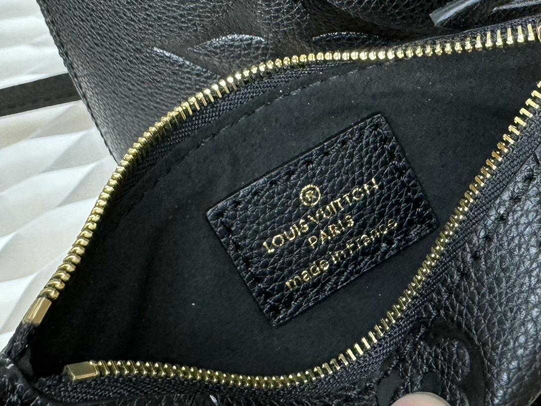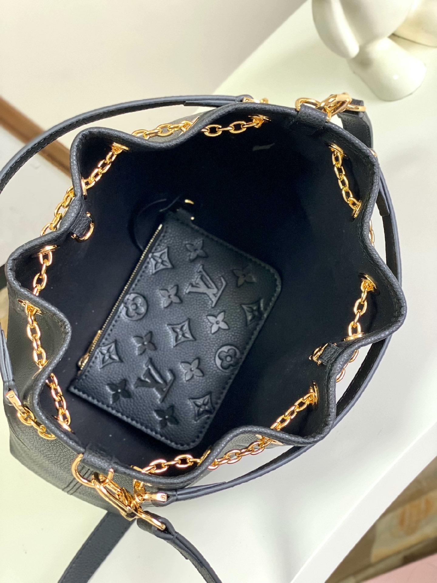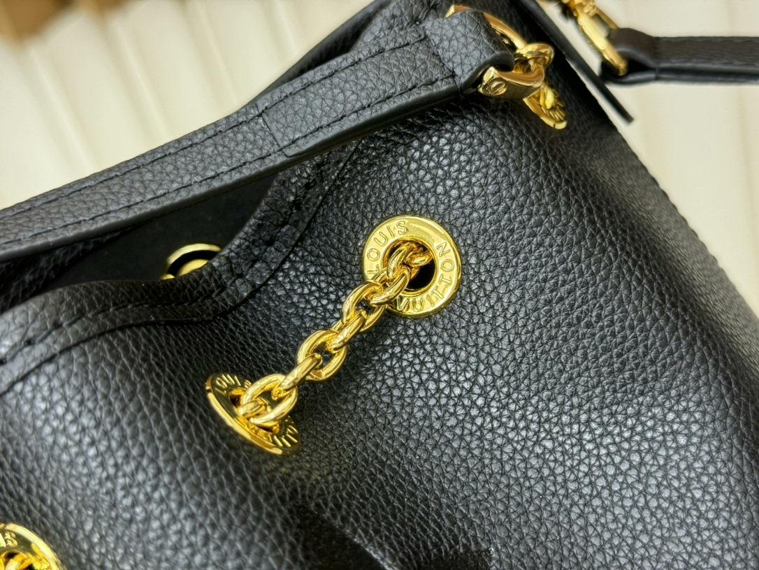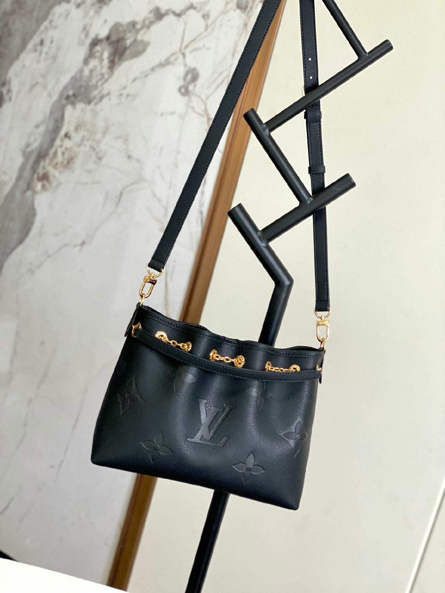 양각 처리한 모노그램 앙프렝뜨 카우하이드 가죽 소재로 선보이는 LV 번들(LV Bundle). 시선을 사로잡는 체인 드로스트링이 특징. 두 개의 핸들을 손으로 또는 팔에 걸쳐 들거나 탈착 가능한 스트랩을 조절하여 편안한 크로스 바디 백과 숄더 백으로 연출할 수 있는 아이템. 동일한 가죽 소재의 탈착형 내부 지퍼 파우치.