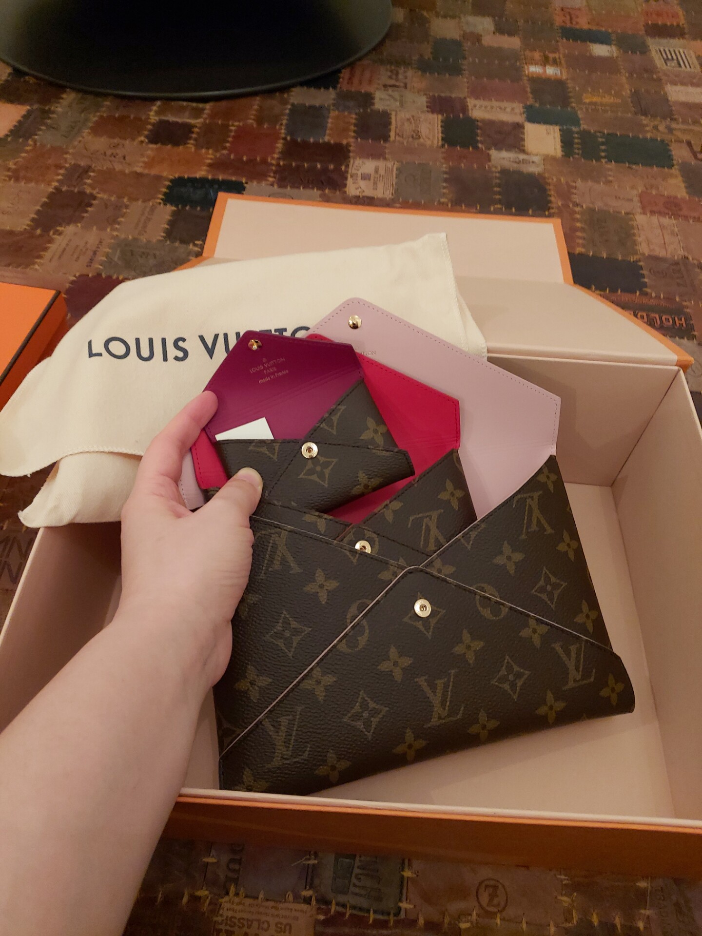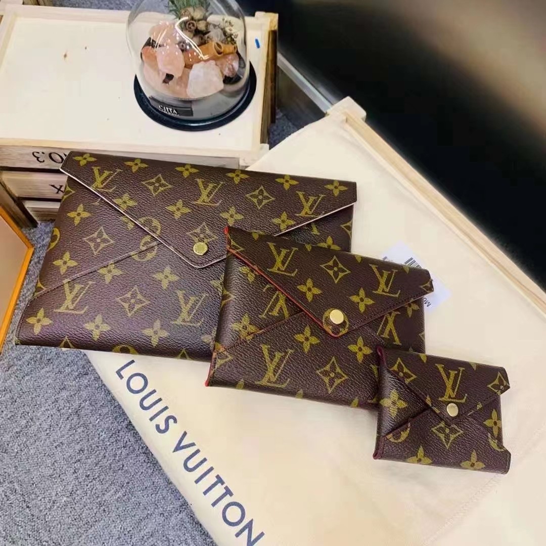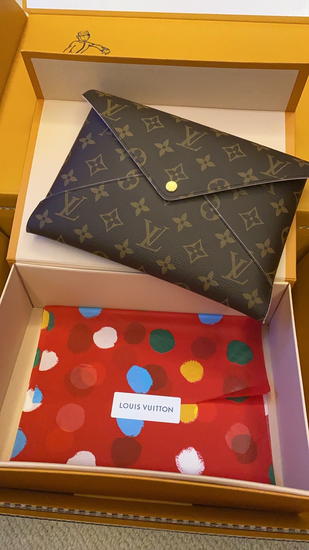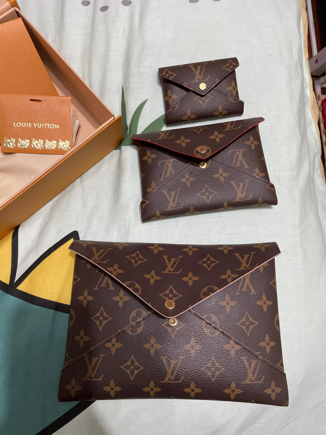 러시아의 마트료시카 인형처럼 차곡차곡 넣을 수 있는 세 개의 엔벨로프 파우치로 구성된 키리가미 포쉐트. 가장 큰 크기에는 미니 태블릿, 서류, 립스틱, 수표책 등 다양한 일상 소지품을, 중간 크기에는 여권이나 열쇠를, 작은 크기에는 카드 또는 동전을 보관할 수 있는 아이템.