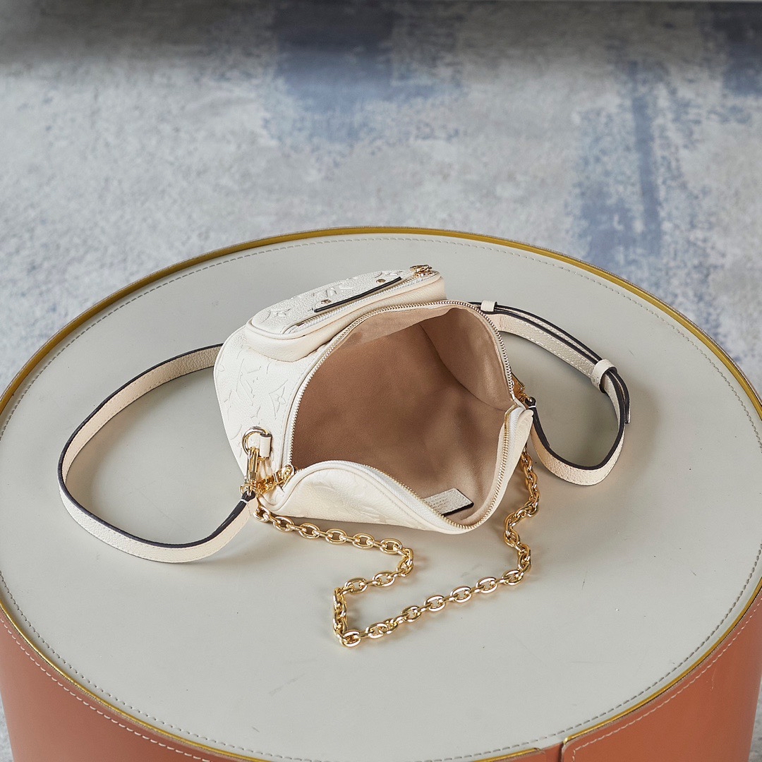 모노그램 패턴을 양각으로 새긴 유연한 모노그램 앙프렝뜨 그레인 가죽 소재로 재해석한 미니 범백. 탈착 가능한 조절형 스트랩과 골드 색상의 탈착형 체인으로 다양하게 연출할 수 있는 트렌디한 아이템. 지퍼형 메인 수납공간. 양각 처리한 가죽 소재의 택이 달린 지퍼형 앞면 포켓.